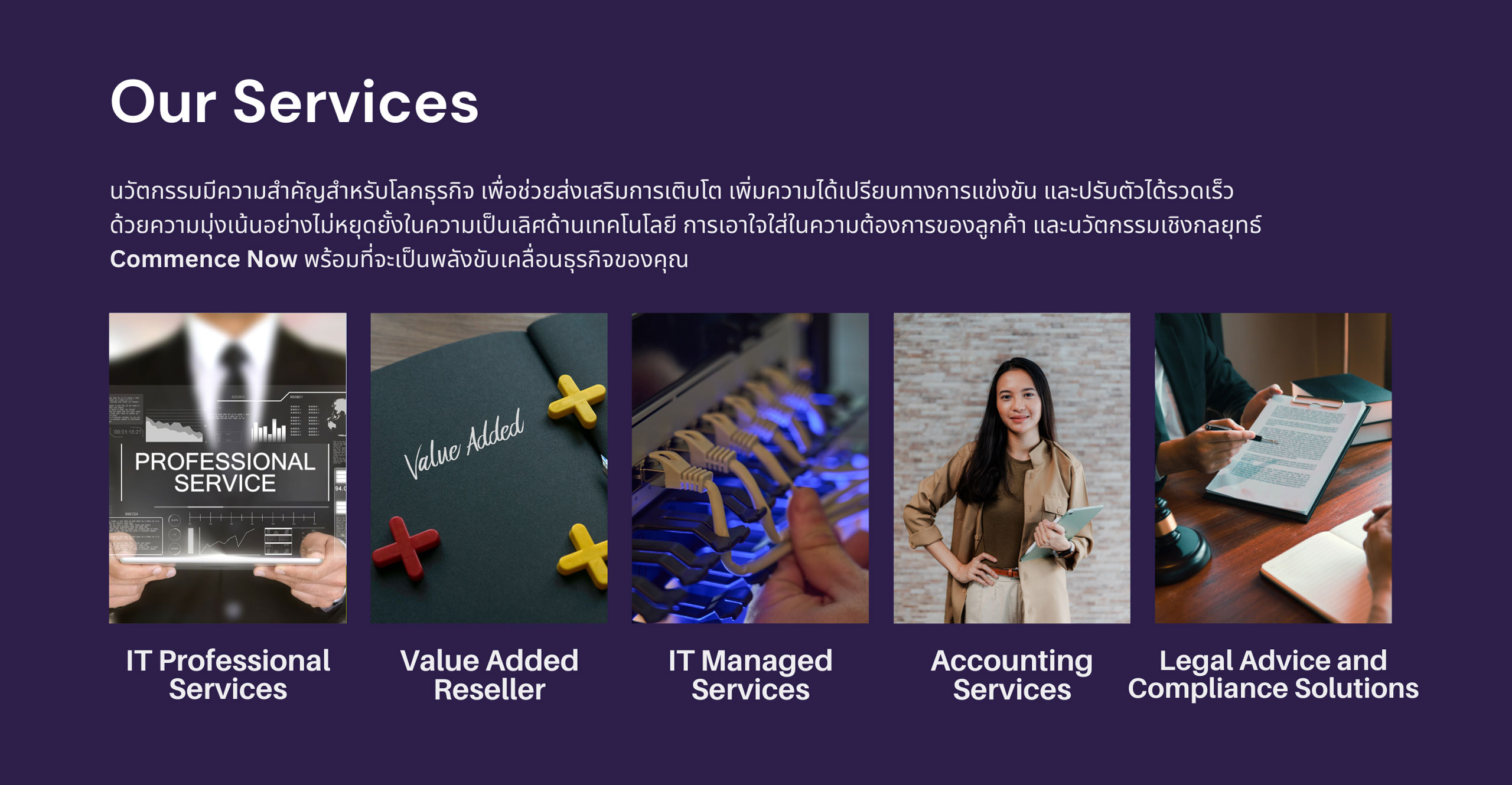 - ด้วยความมุ่งเน้นด้านความเป็นเลิศทางเทคโนโลยี ความพึงพอใจของลูกค้า และนวัตกรรมเชิงกลยุทธ์ เราพร้อมที่จะเป็นพลังขับเคลื่อนสำคัญ – เพื่อเสริมสร้างความสามารถให้ธุรกิจของคุณในโลกดิจิทัล